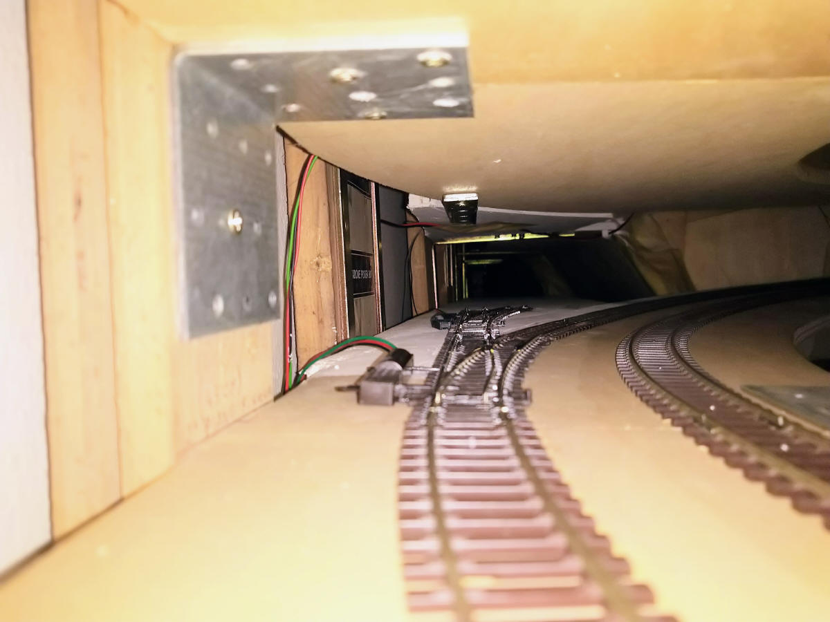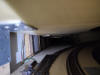 Il piano di appoggio del binario della stazione ipogea, si trova sotto il rettilineo a doppio binario che costtuisce la zona alta (passerella) del plastico |